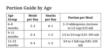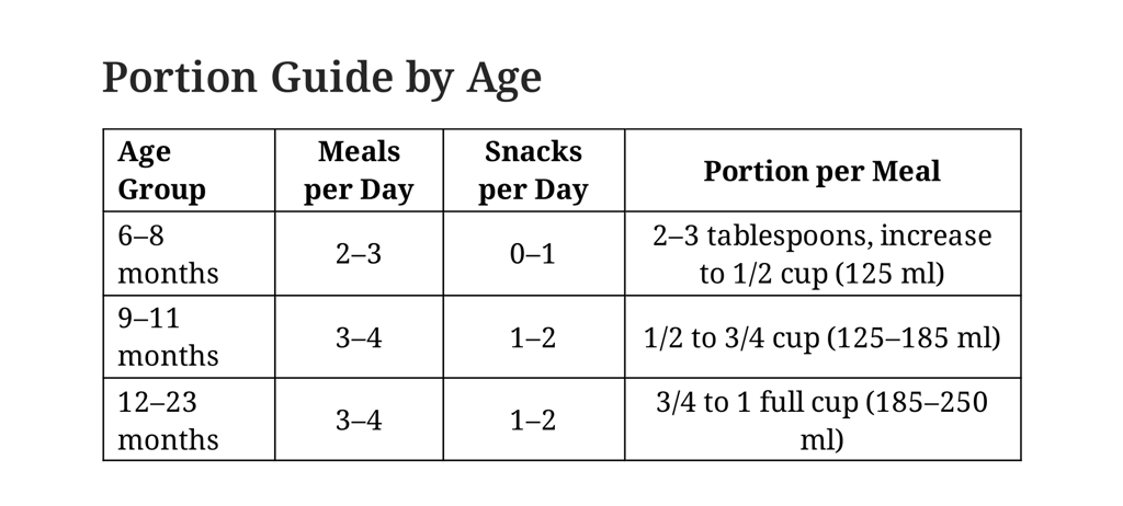 Start complementary foods at 6 months; by 6–8 months give 2–3 meals/day, 9–23 months 3–4 meals/day plus 1–2 snacks.